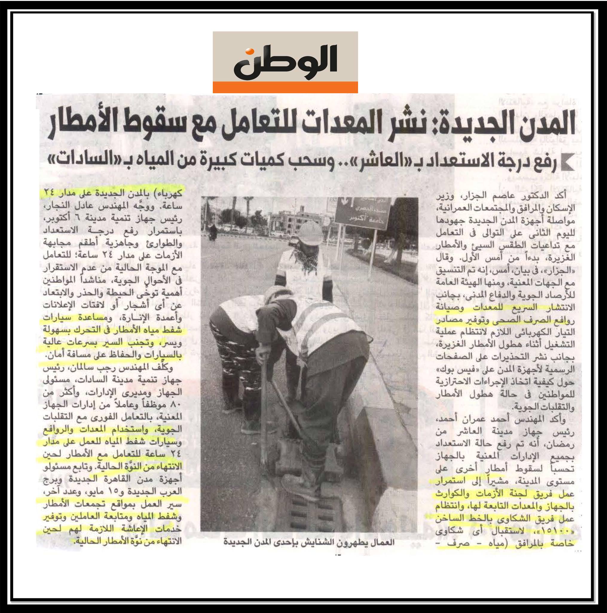 المدن الجديدة: نشر المعدات للتعامل مع سقوط الامطار