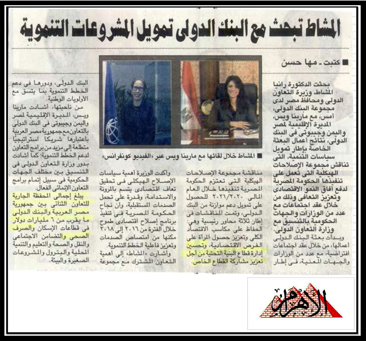 المشاط تبحث مع البنك الدولي تمويل المشروعات التنموية .