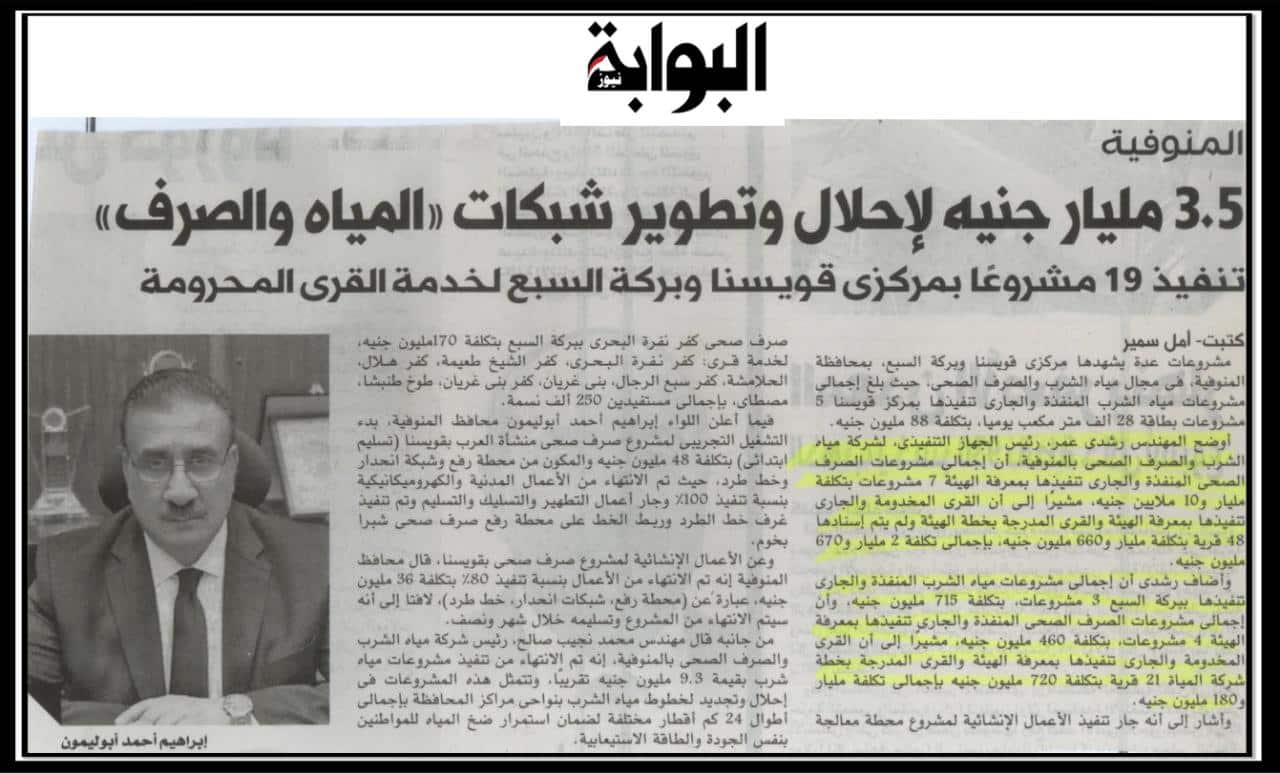 المنوفية : 3.5 مليار جنية لاحلال وتطوير شبكات ” المياه والصرف “