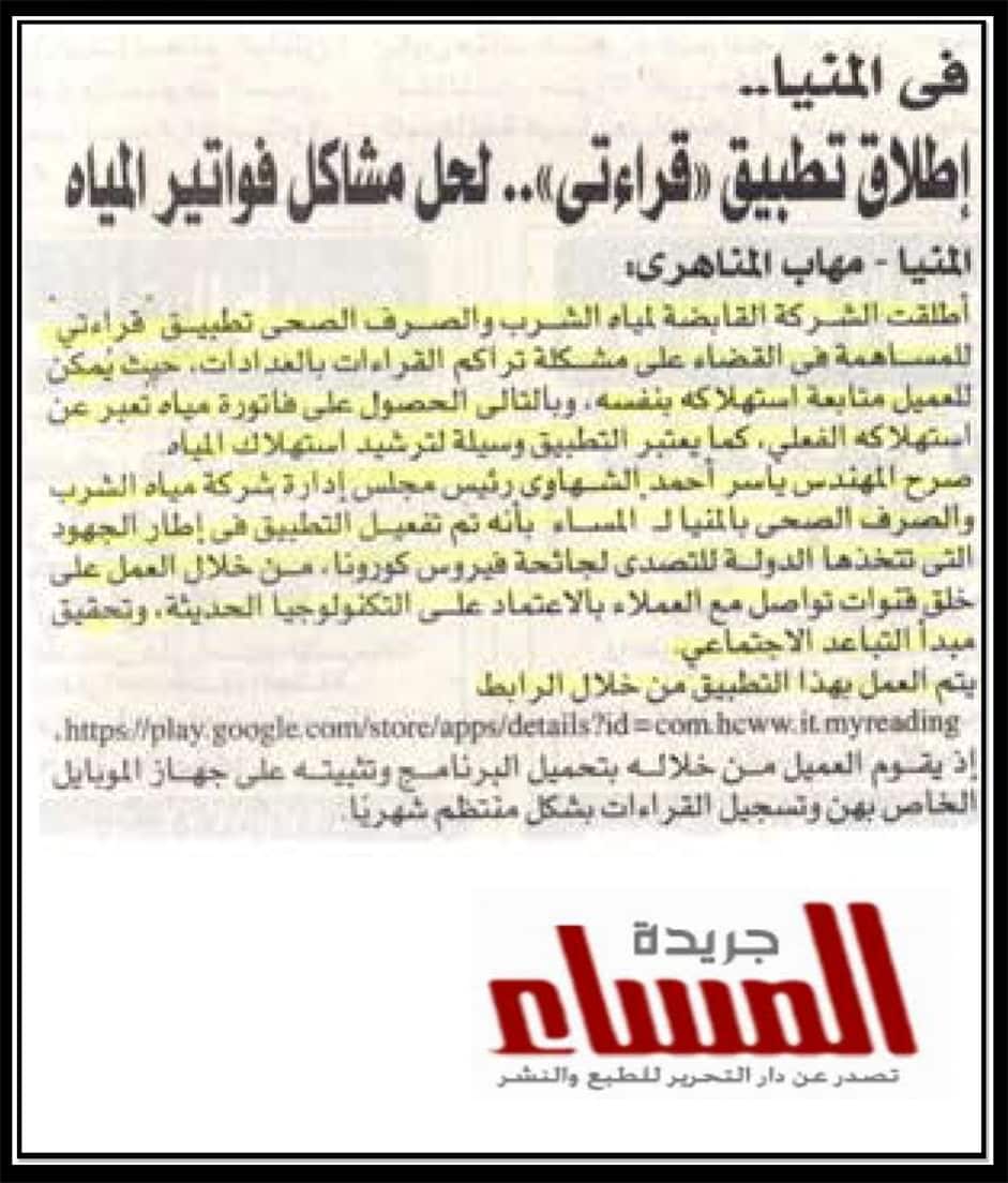 المنيا… إطلاق تطبيق ” قراءتي ” لحل مشاكل فواتير المياه .