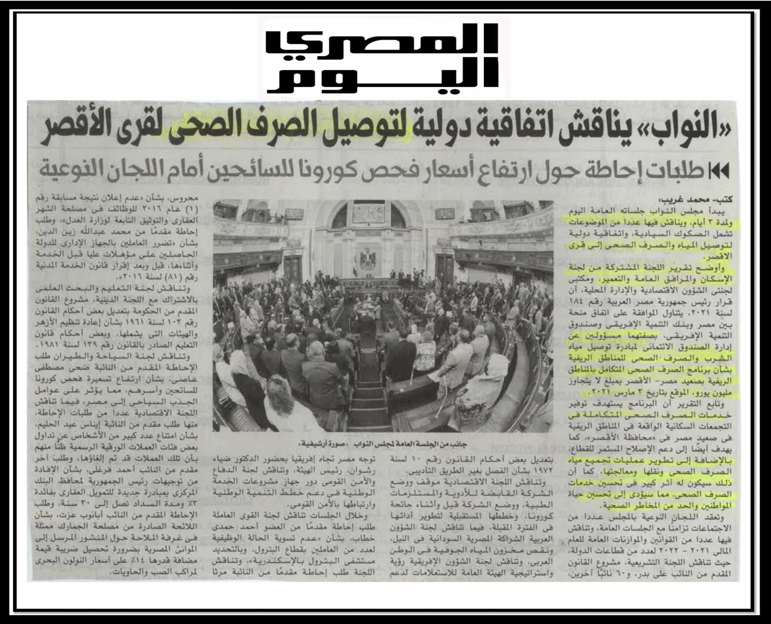 النواب يناقش اتفاقية دولية لتوصيل الصرف الصحي لقرى الاقصر