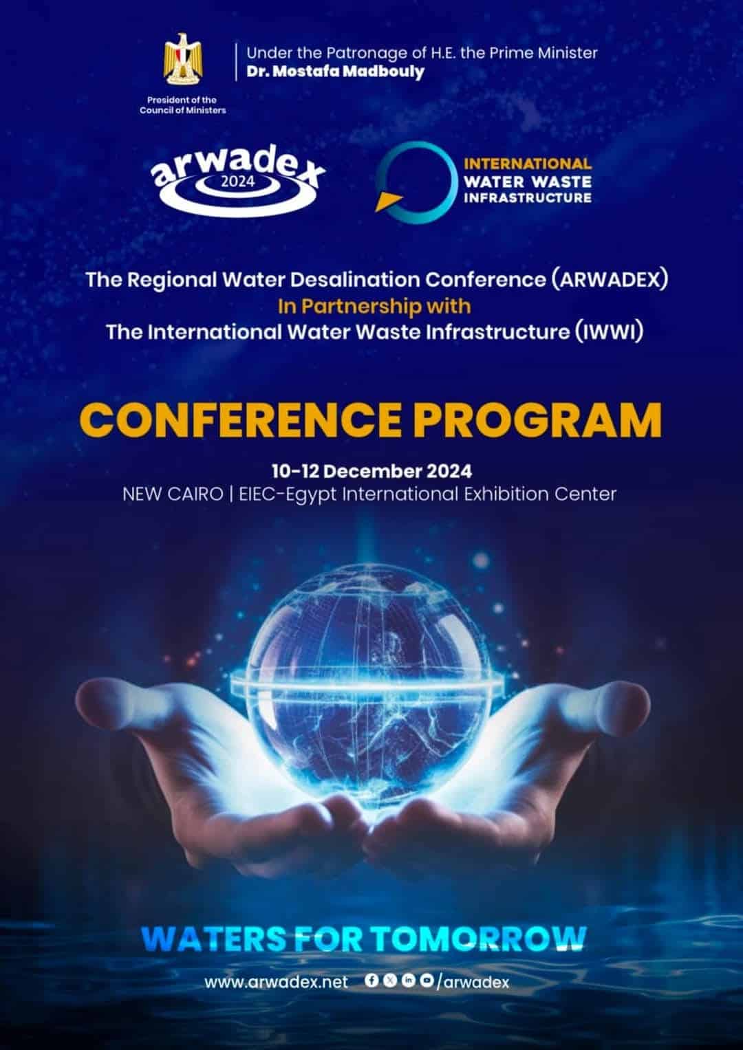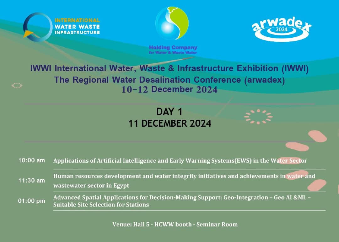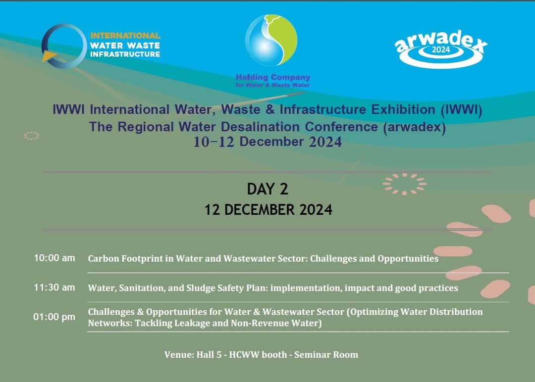 تعلن الشركة القابضة لمياه الشرب والصرف الصحي عن انطلاق فعاليات المعرض والمؤتمر الدولي لتكنولوجيا المياه والصرف الصحي وتكنولوجيا تدوير ومعالجة المخلفات (IWWI) غدًا، والذي يُعقد بالتزامن مع الدورة الثالثة عشرة لمؤتمر ARWADEX لتحلية المياه في الدول العربية، تحت شعار “المياه من أجل الغد”.