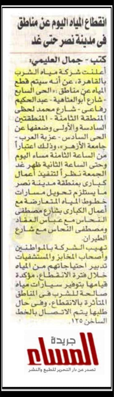 انقطاع المياه اليوم عن مناطق في مدينة نصر حتى غد .