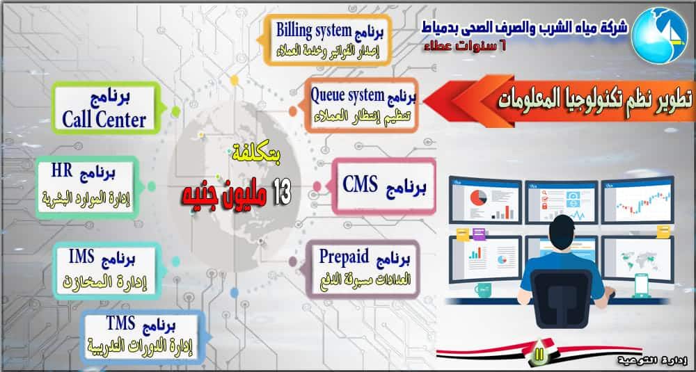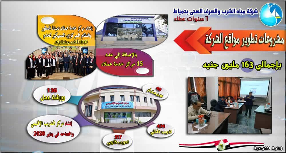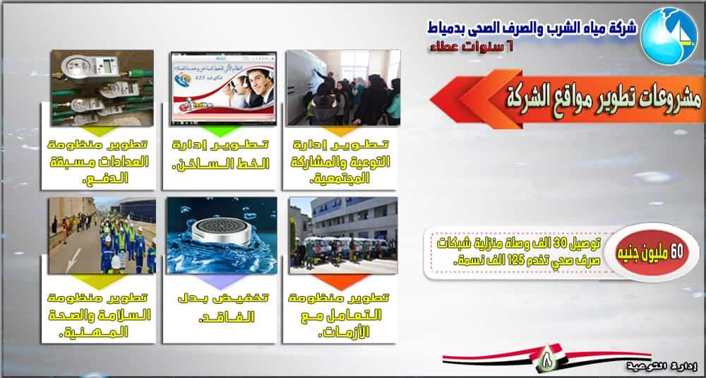 وأشار إلى خطة تطوير الأداء التي قامت بها الشركة لتحسين الخدمات المقدمة للمواطنين والتي شملت تطوير أعمال داخل الشركة بتكلفة ٦٢٨ مليون جنيه شملت تطوير ورفع كفاءة العديد من محطات وروافع كل من قطاعي مياه الشرب والصرف الصحى وكذلك شبكات المياه والصرف وتحديث عدد كبير من الآلات والمعدات بالشركة وبعضها منفذ ذاتيا شمل ذلك إنشاء مركز خدمة عملاء مطور يعمل بالنظام المركزي المميكن بالإضافة لتحديث عدد ١٥ مركز خدمة عملاء أخري قائمة بالمحافظة وإنشاء مركز التدريب الإقليمي والمجهز بأحدث معدات التدريب والوسائل التعليمية والتوضيحية، وإنشاء قاعة مؤتمرات رئيسية بمقر الشركة منفذة ذاتيا ومجهزة بأحدث الأنظمة التكنولوجية، كذلك إنشاء قاعة مخصصة للمتابعة البرلمانية لتلقي طلبات السادة النواب ومتابعتها، وتطوير إدارة الفواتير وتجهيزها بأحدث الطابعات والمعدات والبرامج.