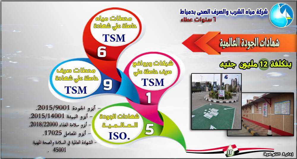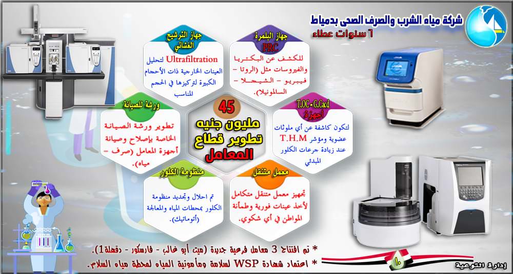 وفي إطار حرص الشركة علي جودة مياه الشرب وكفاءة معالجة الصرف الصحي، أوضح، أنه تم تطوير وتأهيل قطاع المعامل باستثمارات بلغت ٤٥ مليون جنيه وتزويده بأحدث الأجهزة وتجهيز وحدة المعمل المتنقل وتطوير ورشة صيانة أجهزة المعامل وتم افتتاح ٣ معامل فرعية جديدة هي (ميت ابو غالب – فارسكور – دقهلة ١) وكان نتاج لذلك حصول المعمل علي اعتماد شهادة WSP لسلامة ومأمونية المياه لمحطة مياه السلام. كما تم تزويد قطاعات الشركة المختلفة بعدد من البرامج الحديثة لتطوير نظم تكنولوجيا المعلومات بتكلفة ١٣ مليون جنيه، وكان حصاد لذلك المجهود الكبير الذي عملت عليه الشركة في إطار خطة التطوير والتنمية أن حصلت الشركة علي عدد من شهادات الاعتماد والجودة العالمية أهمها ٥ شهادات ISO في مجالات الجودة والبيئة والمعامل وسلامة الغذاء ، وحصول عدد ٦ محطات مياه و ٩ محطات صرف صحي و ١ شبكات وروافع صرف صحي علي شهادة TSM .