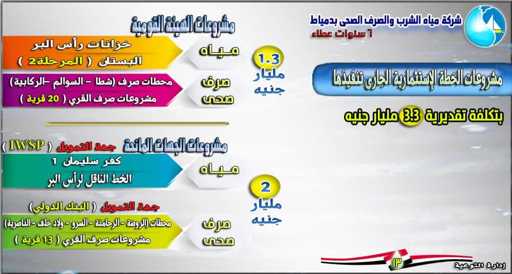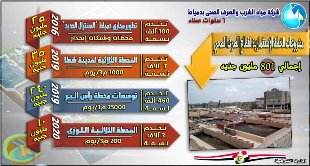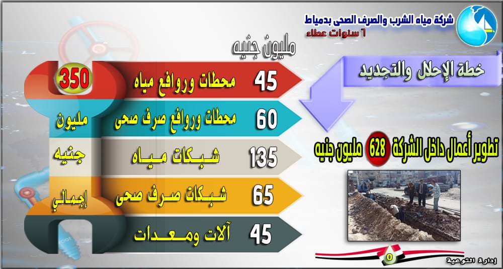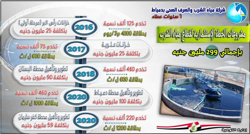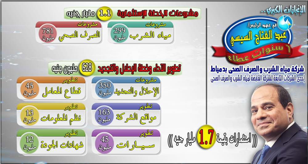 بالانفوجراف .. ١.٧ مليار جنيه استثمارات المياه والصرف الصحي بدمياط خلال ٦ سنوات عطاء وانجازات في عهد الرئيس السيسي.
