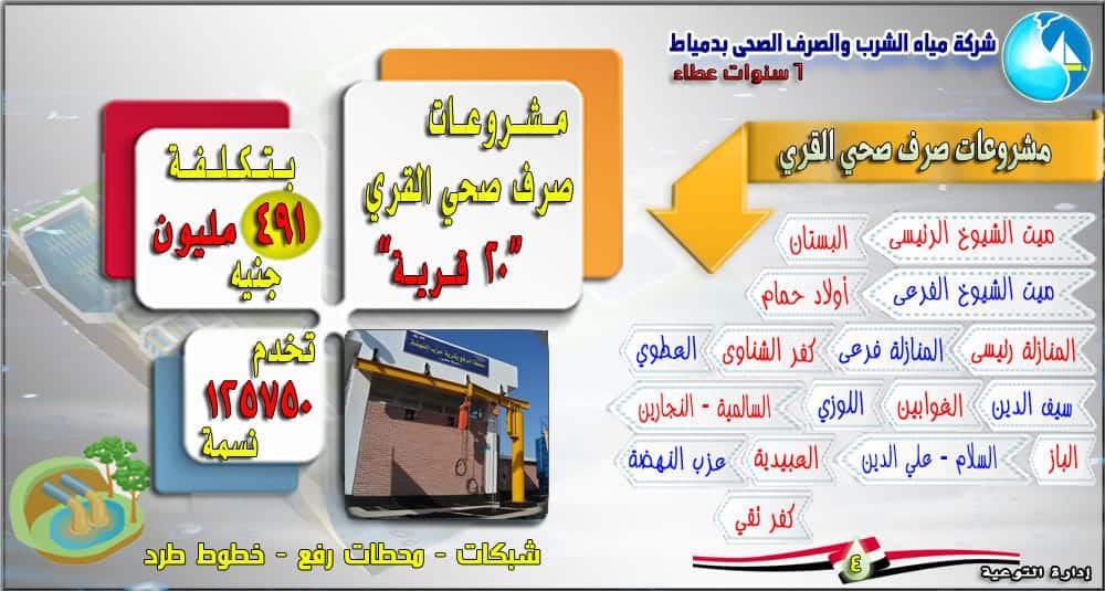 وأكد، أنه تم تنفيذ والاشراف على عدد من المشروعات الكبرى بقطاعي مياه الشرب والصرف الصحى بالمحافظة، في إطار تنفيذ رؤية الدولة لدعم البنية التحتية تحت مظلة وزارة الاسكان والمرافق والمجتمعات العمرانية من خلال الهيئة القومية أو شركة مياه الشرب والصرف الصحى بدمياط، من أهمها مشروعات الخطة الإستثمارية بقطاعي مياه الشرب والصرف الصحي بتكلفة بلغت 1.1 مليار جنيه والتي تمثلت في 5 مشروعات في قطاع مياه الشرب بقيمة 299 مليون جنيه وهي «مشروع خزانات رأس البر (مرحلة أولي) – مشروع خزانات علوية – تطوير وتأهيل محطة مياه البستان – تطوير وتأهيل محطة مياه دمياط – تطوير وتأهيل محطة مياه كفر سليمان» , كما تم تنفيذ عدد 5 مشروعات في قطاع الصرف الصحي بقيمة 801 مليون جنيه وهي «تطوير مجاري دمياط (السنترال الجديد) – المحطة الثلاثية لمدينة شطا – توسعات محطة رأس البر – المحطة الثلاثية باللوزي»، بالإضافة لمشروعات صرف صحي القري والتي تقدم خدمة الصرف الصحي لعدد ٢٠ قرية محرومة شملت شبكات ومحطات رفع وخطوط طرد.