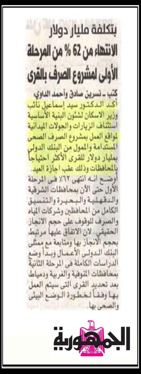 بتكلفة مليار دولار الانتهاء من 62% من المرحلة الاولى لمشروع الصرف الصحي بالقرى .