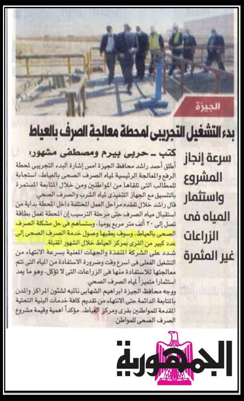 بدء التشغيل التجريبي لمحطة معالجة الصرف بالعياط .