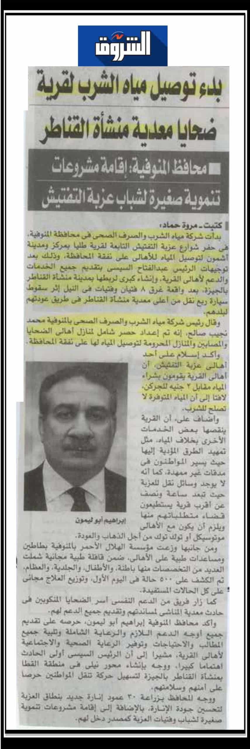 بدء توصيل مياه الشرب لقرية ضحايا معدية منشأة القناطر.