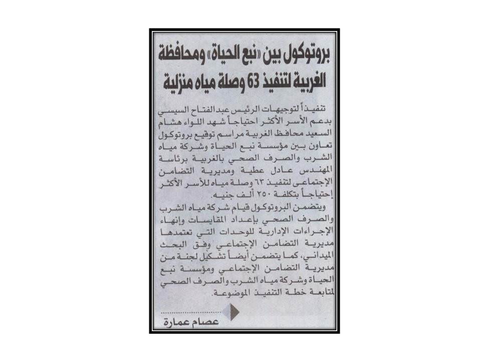 بروتوكول بين “نبع الحياة ” ومحافظة الغربية لتنفيذ 63 وصلة مياه منزلية