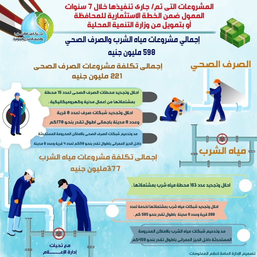 وأضاف أن اجمالى تكلفة مشروعات الصرف الصحى وصلت لـ 221 مليون جنيه تمثلت في إنشاء احلال وتجديد محطات الصرف الصحى ( معالجة ورفع ) لعدد 15 محطة بمشتملاتها من اعمال مدنية وكهروميكانيكية، واحلال وتجديد شبكات صرف صحى ( شبكات انحدار – مطابق خطوط طرد ) لعدد 8 قرية وعدد 8 مدينة باجمالى اطوال تقدر بنحو 170كم بهدف تحسين الوضع الراهن لمحطات المعالجة والرفع للصرف الصحى واستدامة الخدمة، واحلال وتجديد خط طرد سرس الليان بهدف استدامة الخدمة بالصرف الصحى بنواحى مدينتى الباجور وسرس الليان بالإضافة إلى مد وتدعيم شبكات الصرف الصحى بالاماكن المحرومة المستحدثة داخل الحيز العمرانى باطوال تقدر بنحو 50كم لعدد 4 قرية وعدد 8 مدينة بهدف توصيل خدمة الصرف الصحى للاماكن المحرومة داخل الحيز العمرانى لرفع مستوى المعيشة.