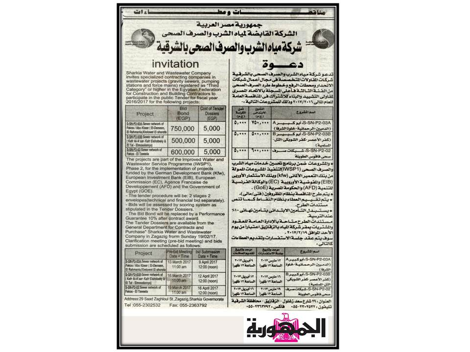 تدعو شركة مياه الشرب والصرف الصحي بالشرقية :- شركات المقاولات المتخصصة في مجال أعمال شبكات المياه ومحطات الرفع وخطوط طرد الصرف الصحي من الفئة الثالثة المسجلة بالاتحاد المصري لمقاولي التشييد والبناء للاشتراك في المناقصات العامة للعام المالي 2016/2017 :-…..2017/2/18