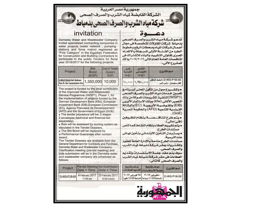 تدعو شركة مياه الشرب والصرف الصحي بدمياط : شركات المقاولات المتخصصة في مجال أعمال شبكات المياه ومحطات الرفع وخطوط طرد الصرف الصحي من الفئة الاولى المسجلة بالاتحاد المصري لمقاولي التشييد والبناء للاشتراك في المناقصات العامة للعام المالي …..2017/1/14