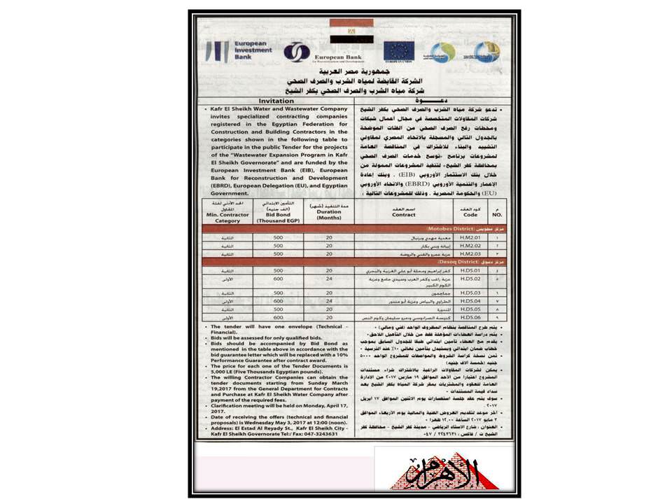 تدعو شركة مياه الشرب والصرف الصحي بكفر الشيخ :- شركات المقاولات المتخصصة في مجال أعمال شبكات ومحطات الرفع من الفئات الموضحة بالجدول التالي المسجلة بالاتحاد المصري لمقاولي التشييد والبناء للاشتراك في المناقصات العامة لمشروعات برنامج توسع خدمات الصرف الصحي بمحافظة كفر الشيخ :-…..2017/3/13