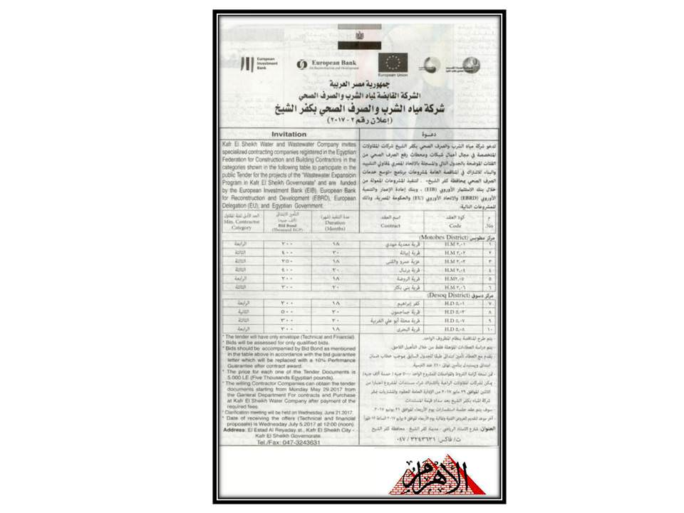تدعو شركة مياه الشرب والصرف الصحي بكفر الشيخ :- شركات المقاولات المتخصصة في مجال أعمال محطات رافع الصرف الصحي من الفئات الموضحة في الجدول التالي والمسجلة بالاتحاد المصري لمقاولي التشييد والبناء للاشتراك في المناقصة العامة …….2017/5/27