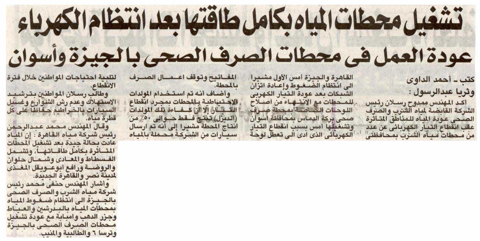 تشغيل محطات المياه بكامل طاقتها بعد انتظام الكهرباء – عودة العمل فى محطات الصرف الصحى بالجيزة وأسوان