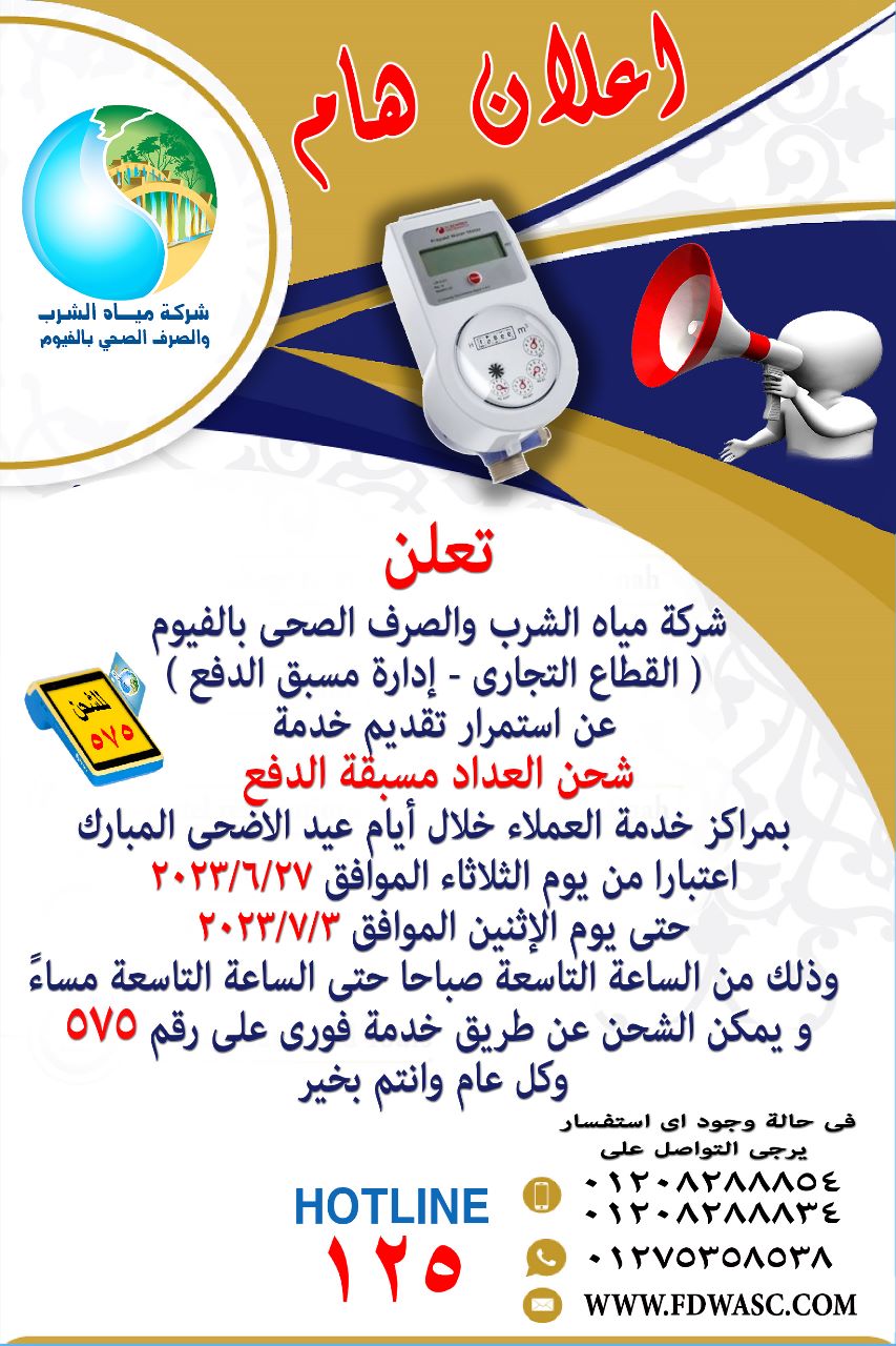 أعلنت شركة مياه الشرب والصرف الصحي بالفيوم عن تشغيل مراكز شحن عدادات المياه مسبقة الدفع خلال إجازة عيد الأضحي المبارك وذلك إعتبارا من الثلاثاء الموافق ٢٠٢٣/٦/٢٧ حتي الإثنين الموافق ٢٠٢٣/٧/٣ من الساعة