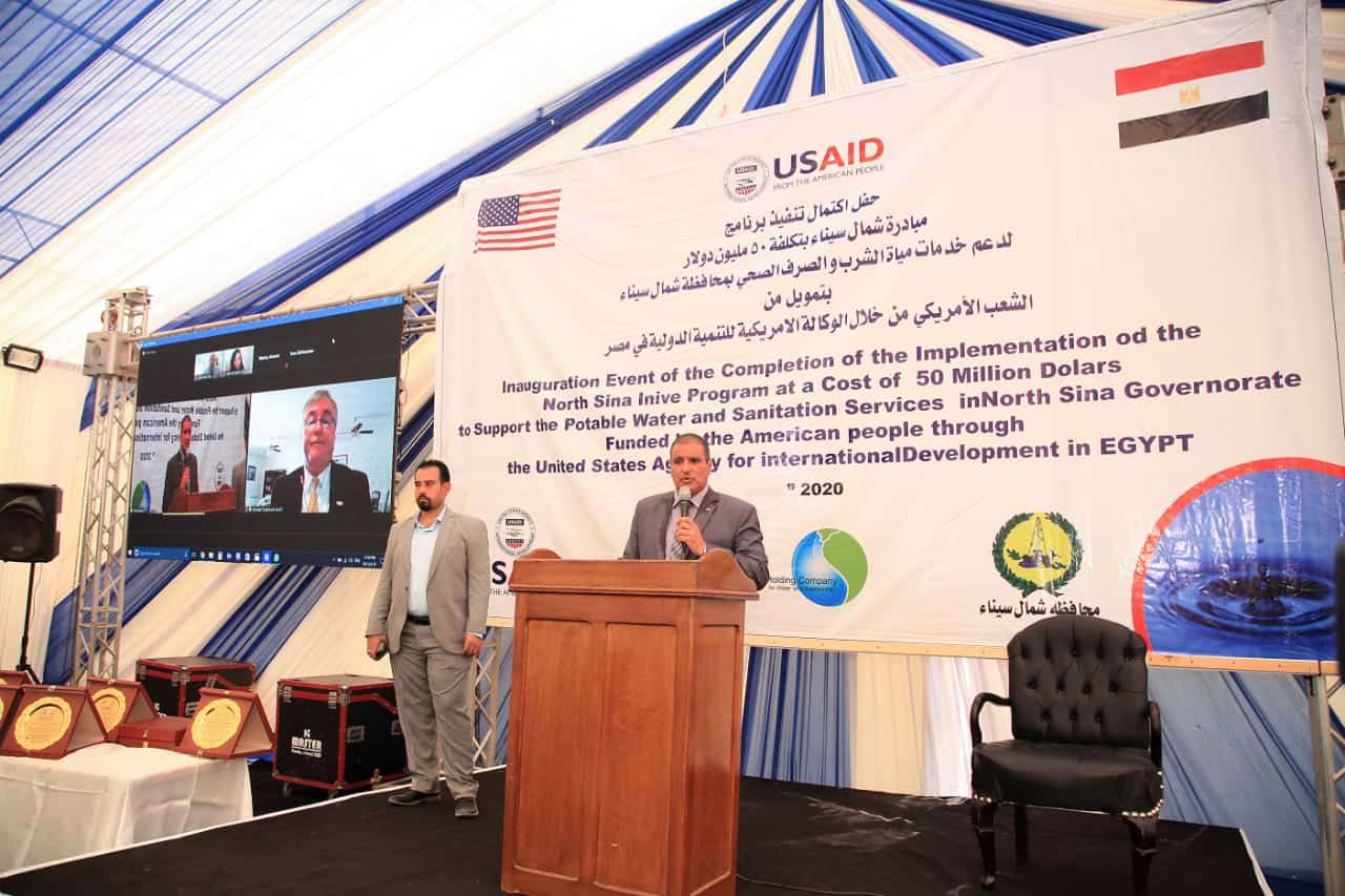 جاء ذلك أثناء حفل انتهاء تنفيذ وتشغيل مشروعات مياه الشرب والصرف الصحى بشمال سيناء والممولة من الوكالة الامريكية للتنمية الدولية في إطار اتفاقية مبادرة شمال سيناء في ذكرى انتصارات نصر اكتوبر ، بحضور اللواء أ ح دكتور محمد عبد الفضيل شوشة محافظ شمال سيناء، والسيد مايكل تروبلد نيابة عن السيدة ليزلي ريد مدير بعثة الوكالة الأمريكية للتنمية الدولية / مصر والمهندس رجب عرفة خليل رئيس قطاع المشروعات بشركة مياه سيناء والمهندس محمد على صبرى وطارق الباز كممثلين عن الوكالة الأمريكية للتنمية الدولية والمهندس صبري سلامة العضو المنتدب لشركة الصعيد للمقاولات و القيادات الشعبية و التنفيذية بالمحافظة.