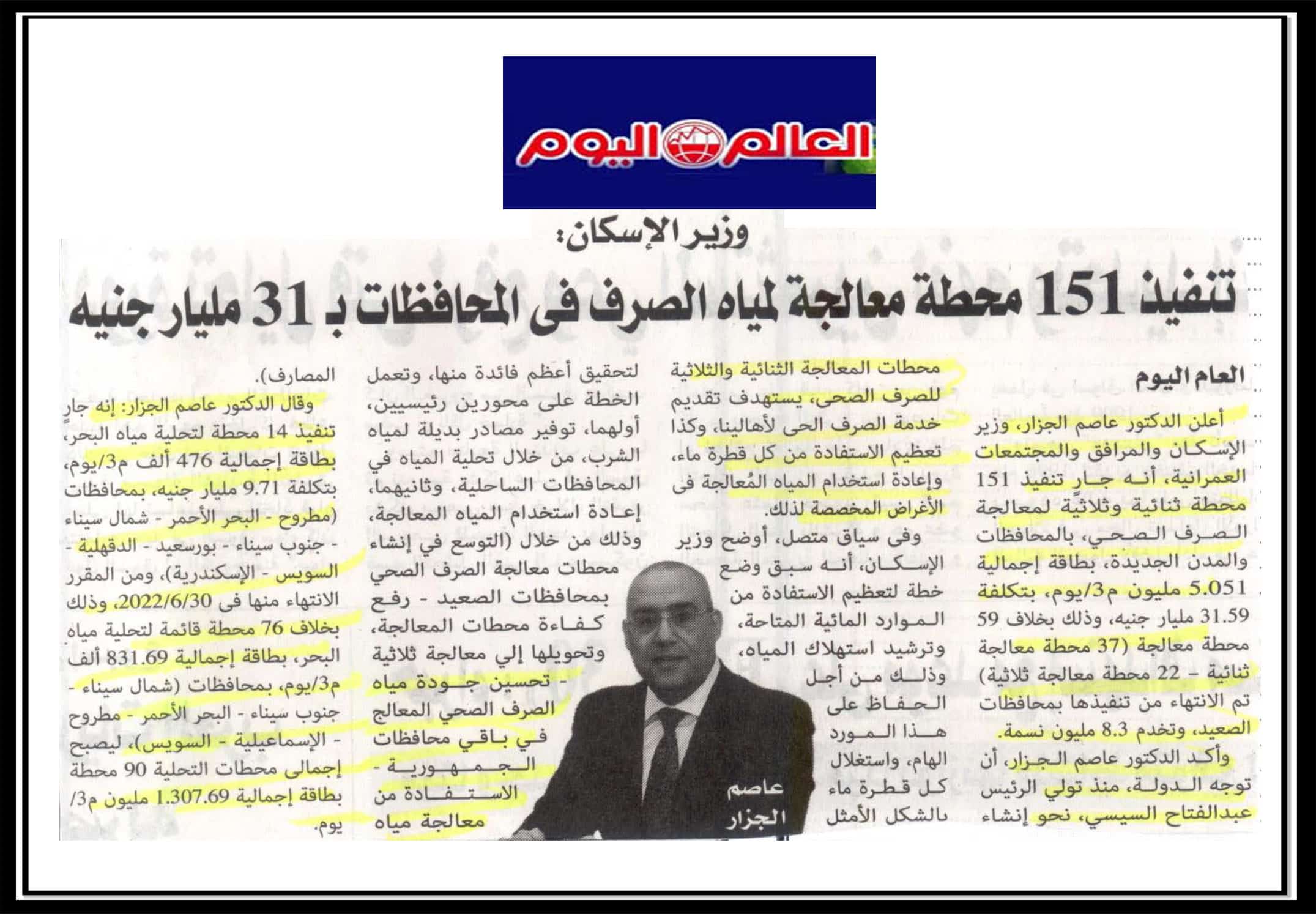 تنفيذ 151 محطة معالجة لمياه الصرف في المحافظات ب 31 مليار جنيه