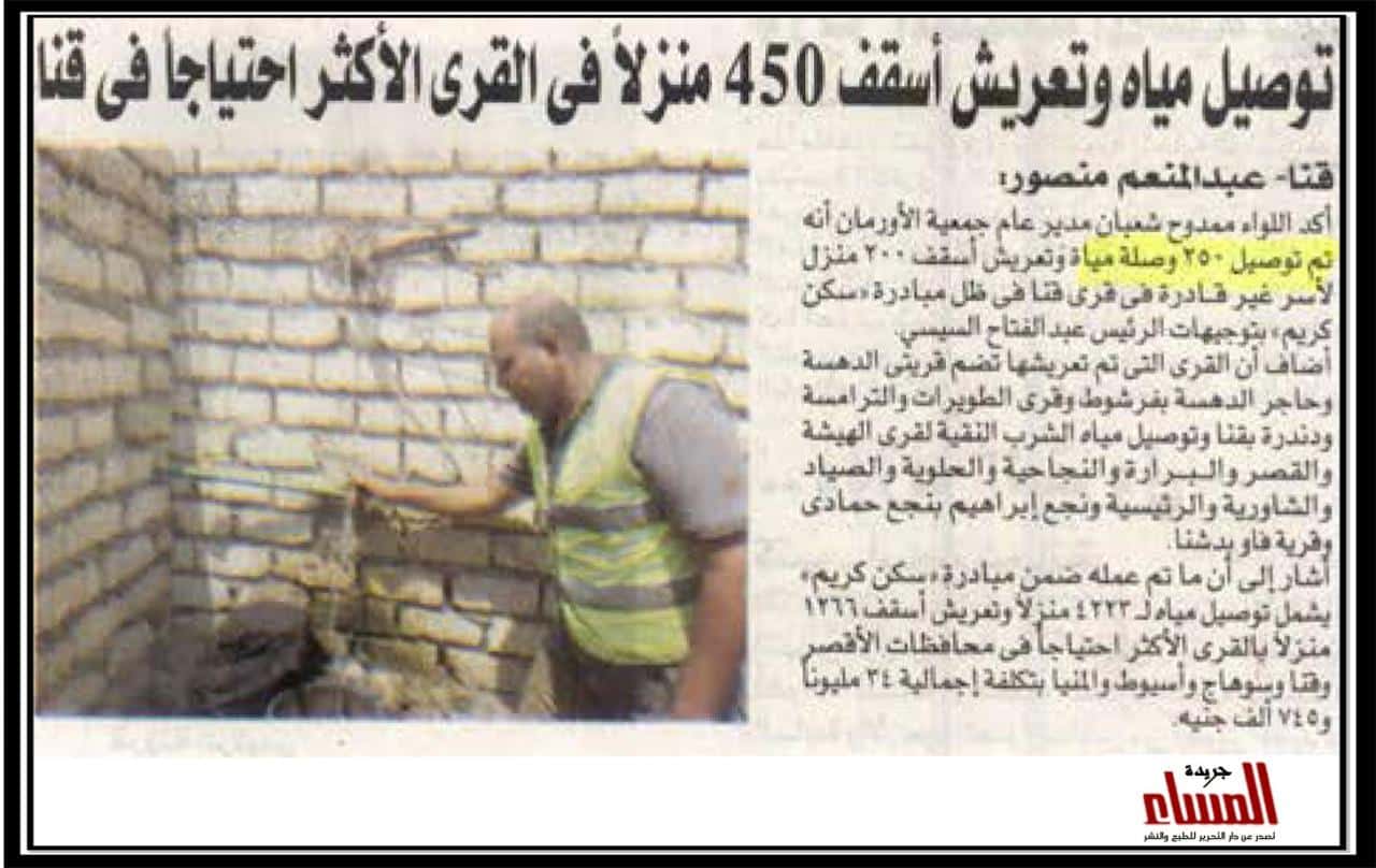 توصيل مياه وتعريش اسقف 450 منزلا في القرى الاكثر احتياجا في قنا .