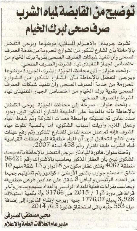 توضيح من القابضة لمياه الشرب .. صرف صحى لبرك الخيام