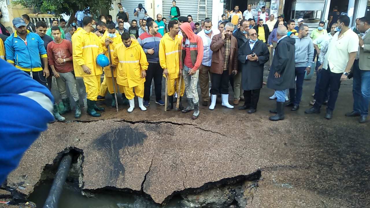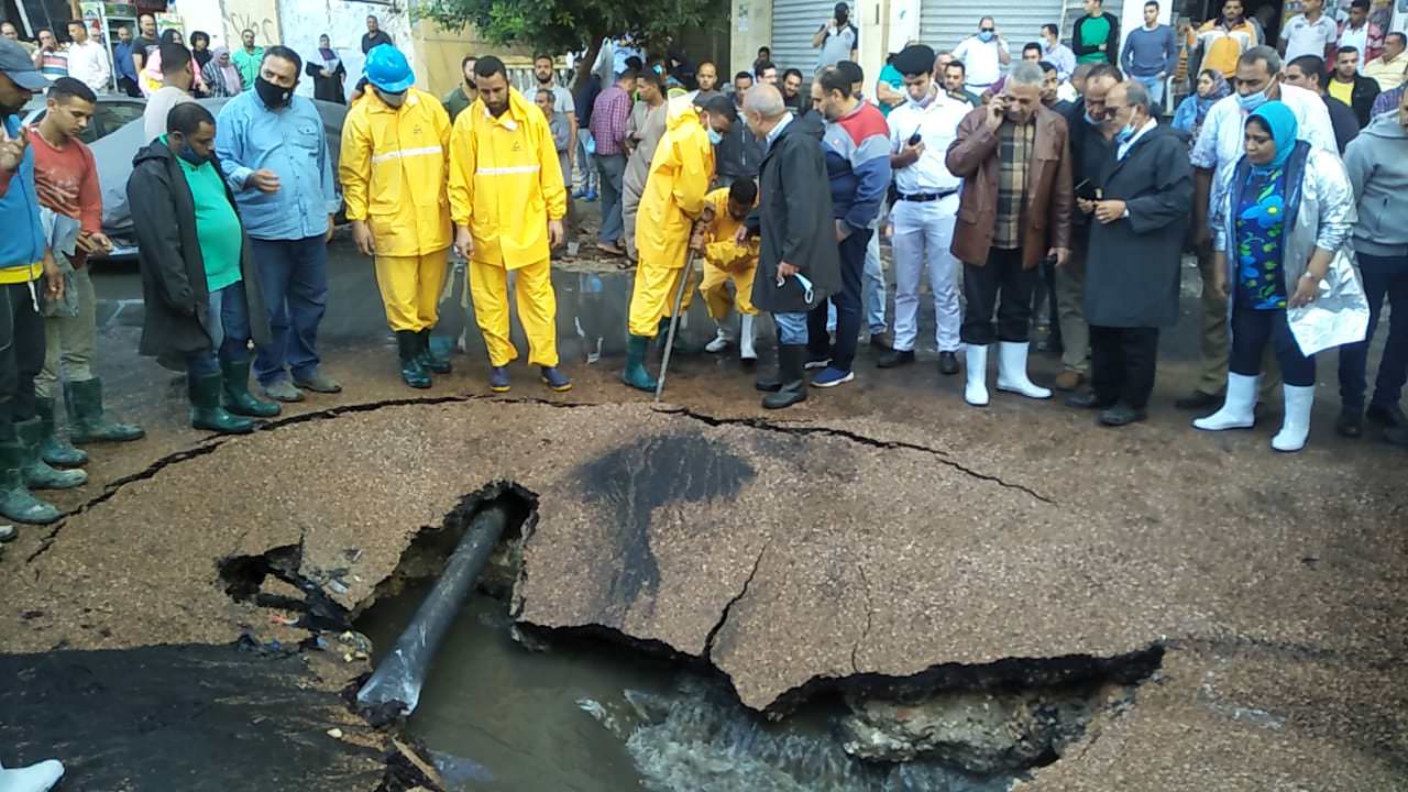 حدوث كسر ماسورة صرف صحى قطر 1200 مم مما أسفر عن حدوث انهيار ارضى بشارع النصر بسموحة .