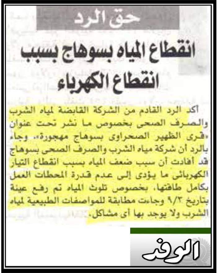 حق الرد: انقطاع المياه بسوهاج بسبب انقطاع الكهرباء.
