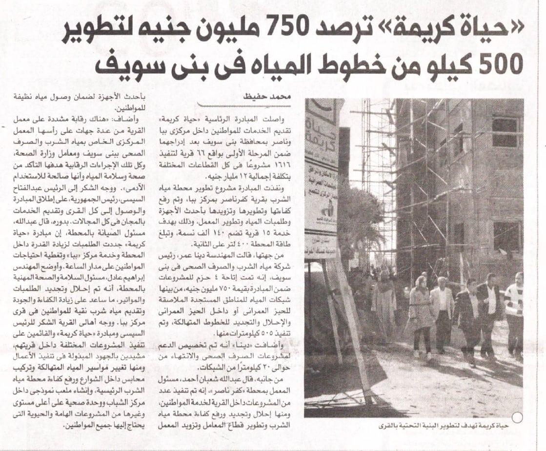 حياة كريمة … ترصد 750 مليون جنية لتطوير 500 كليو من خطوط المياه في بني سويف.