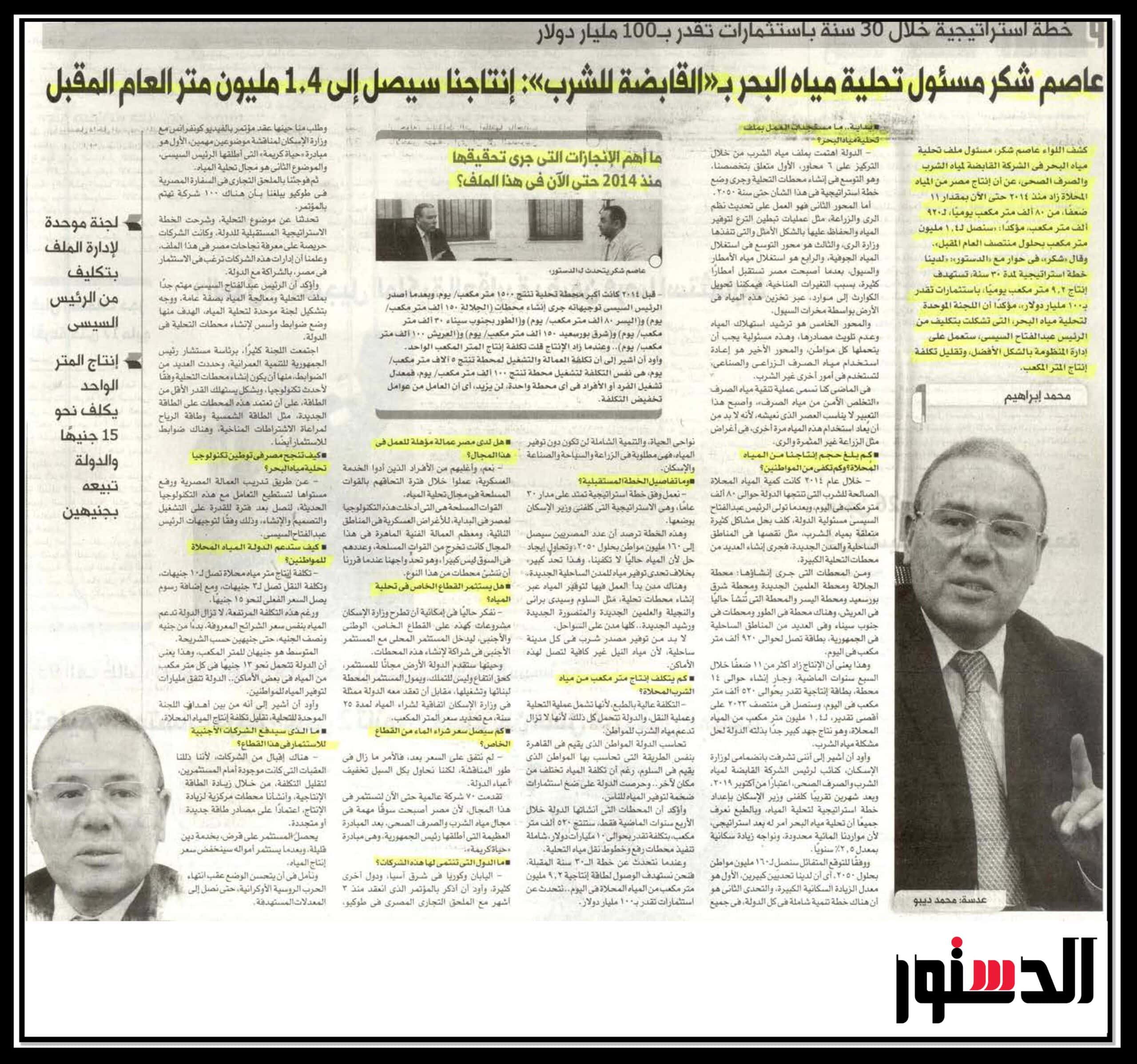 خطة إستراتيجية خلال 30 سنة باستثمارات تقدر بـ 100 مليار دولار عاصم شكر مسئول تحلية مياه البحر بـ” القابضة للمياه”: انتاجنا سيصل الي 1.4 مليون متر العام المقبل.