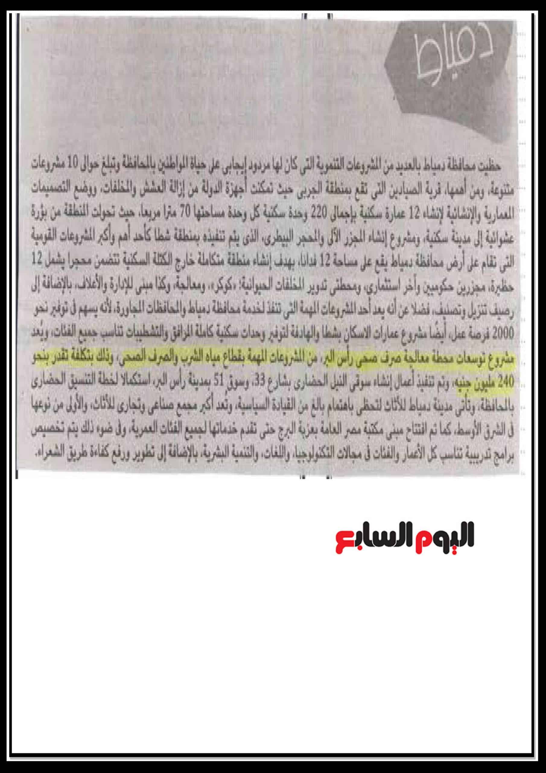 دمياط: مشروع توسعات محطة معالجة صرف صحي راس البر تقدر بنحو 240 مليون جنية .