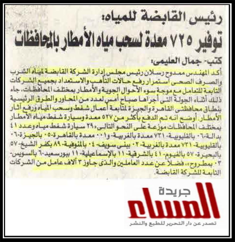 رئيس القابضة للمياه: توفير 725 معدة لسحب مياه الامطار بالمحافظات .