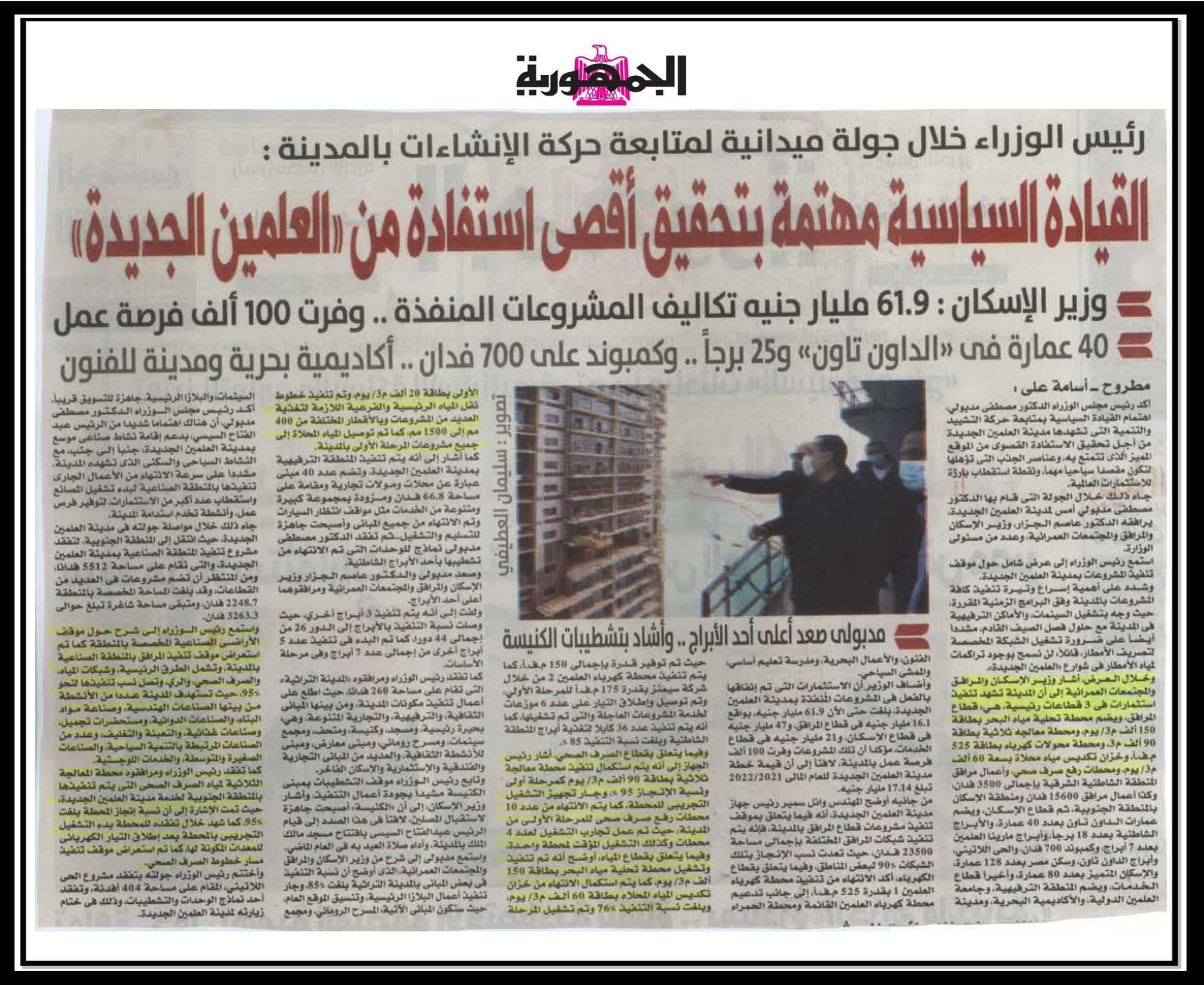 رئيس الوزراءخلال جولة ميدانية لمتابعة حركة الانشاءات بالمدينة.. القيادة السياسية مهتمة بتحقيق أقصى استفادة من ” العلمين الجديدة”