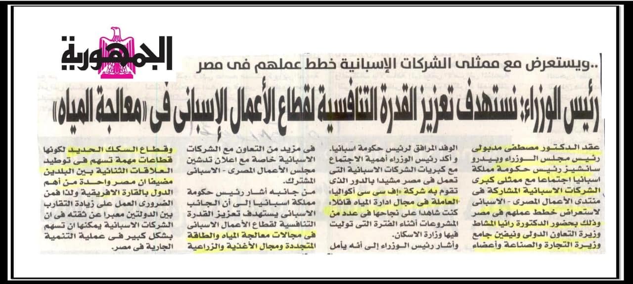 رئيس الوزراء: نستهدف تعزيز القدرة التنافسية لقطاع الاعمال الاسباني في معالجة المياه