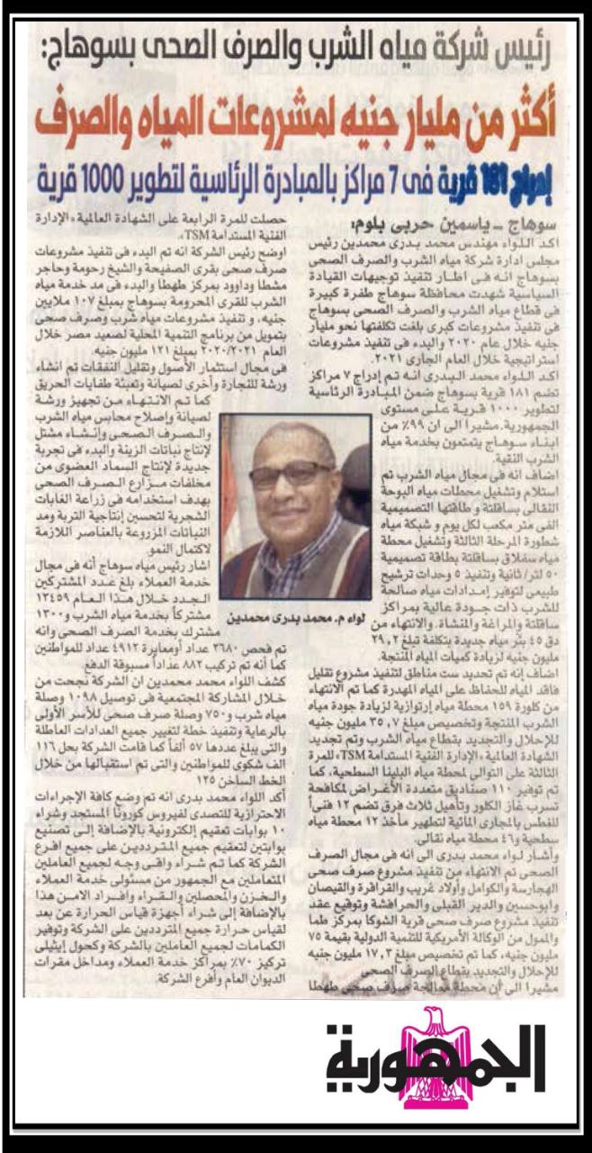 رئيس شركة مياه الشرب والصرف الصحي بسوهاج …اكثر من مليار جنية لمشروعات المياه والصرف .
