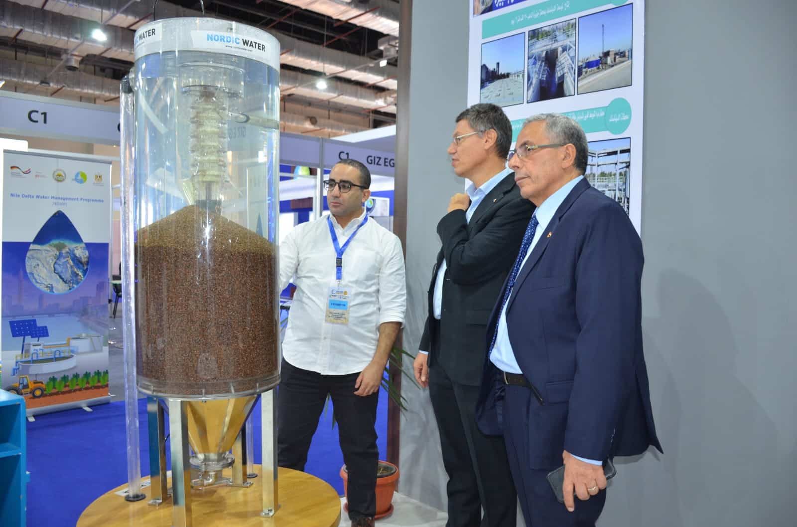كما تم عرض نموذج محاكاة لمحطة تنقية مياه “ديناسند” تُستخدم في تنقية مياه الشرب، وتتميز بتوفير مساحات الأرض التى يتم استخدامها فى المحطات العادية، وانتاج كميات أكبر من المياه، بالإضافة إلى التكاليف الاقل والجودة العالية، حيث تستخدم محطات: :توسعات جزيرة الدهب والحجارة والشوبك ومزغونة” تكنولوجيا “الديناساند” في تنقية مياه الشرب