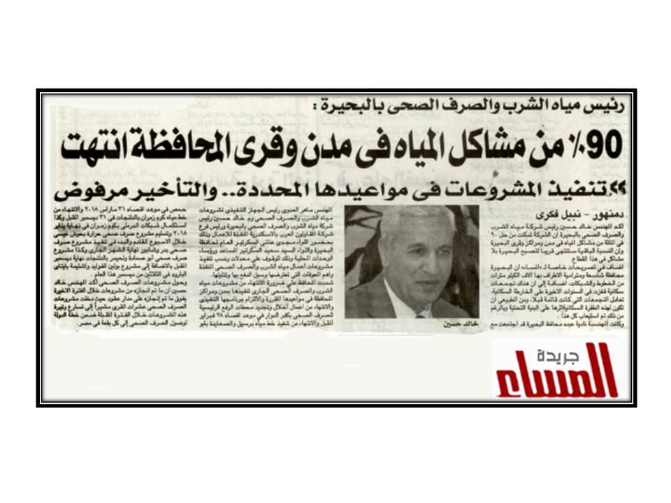 رئيس مياه الشرب والصرف الصحي بالبحيرة : 90 %من مشاكل المياه في مدن وقرى المحافظة انتهت .