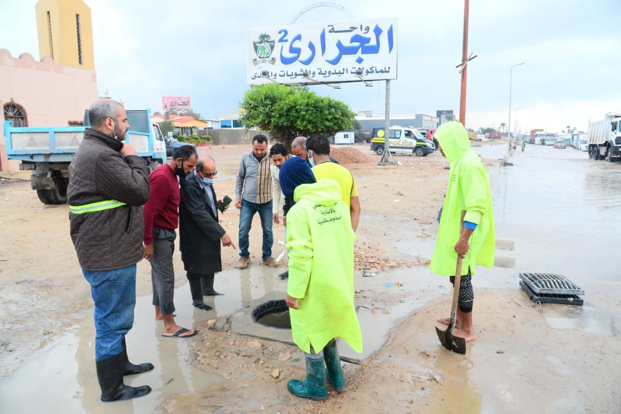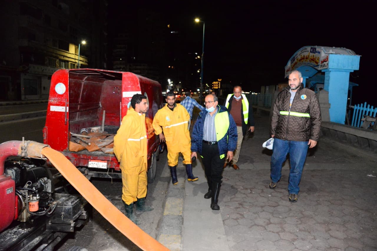 وأفاد بالتعامل مع عدد من النقاط الساخنة بمعدات الشركة في مناطق (المندرة أمام الشيراتون -محمد نجيب على الكورنيش -أمام فندق تيوليب _محرم بك أسفل كوبري أبو عين واحدة -أمام حي شرق بسيدي جابر – جمال عبد الناصر وملك حفنى – أمام فندق تيوليب – أصعب نقطة لتجمع المياه بمنطقة الجرارى بالكيلو 23 صحراوي) حيث يتواجد أسطول من معدات شركتي المياه والصرف الصحي للتعامل مع التجمعات.
