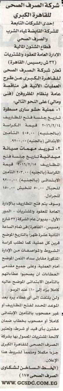 شركة الصرف الصحي للقاهرة الكبرى …26-1-2016 جريدة الأخبار 26/01/2016| Related Posts مناقصة عامة: شركة مياه الشرب والصرف الصحي بالأقصر 01/04/2026 مناقصة عامة: شركة مياه الشرب والصرف الصحي بأسيوط والوادى الجديد 31/03/2026 مناقصة عامة: شركة مياه الشرب والصرف الصحي بمحافظات القناة 31/03/2026 مناقصة عامة: شركة مياه الشرب بالإسكندرية 29/03/2026 مناقصة عامة: شركة مياه الشرب والصرف الصحي بالأقصر 27/03/2026 مناقصة عامة: شركة مياه الشرب والصرف الصحى بمطروح 12/01/2026 مناقصة عامة: شركة مياه الشرب والصرف الصحى بكفر الشيخ 01/01/2026 مناقصة عامة: شركة مياه الشرب والصرف الصحى بمحافظات القناة 01/01/2026