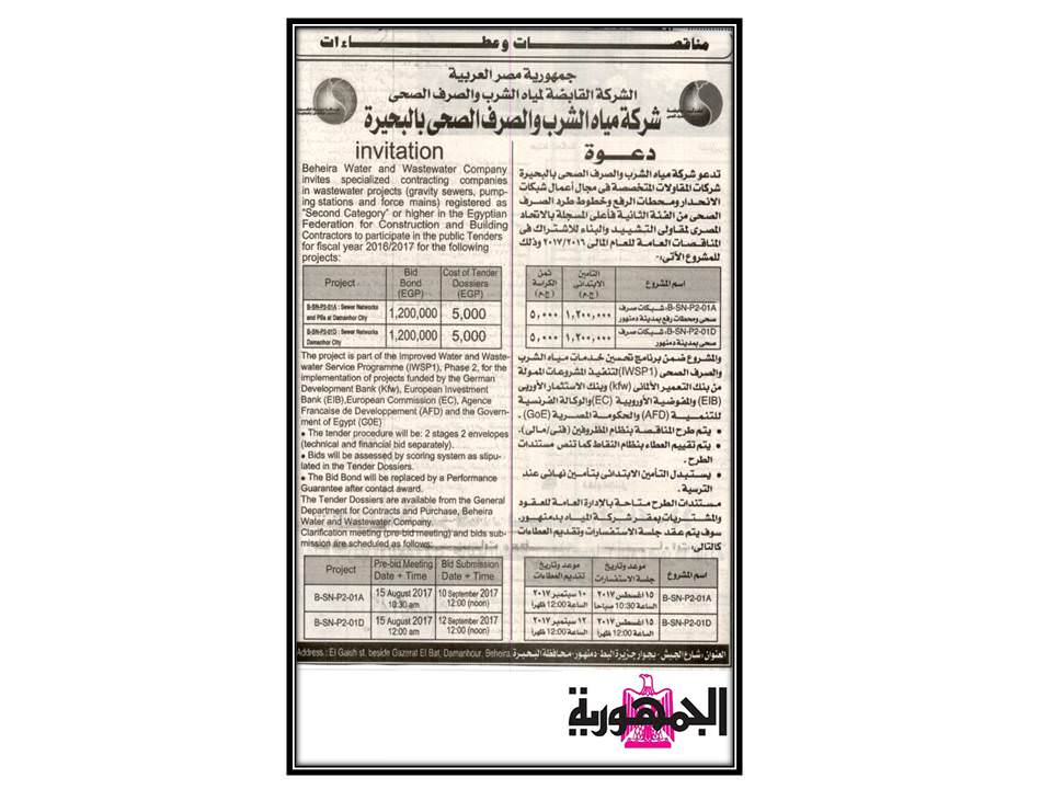 تدعو شركة مياه الشرب والصرف الصحي بالبحيرة : شركات المقاولات المتخصصة في مجال أعمال شبكات الانحدار و محطات رافع وخطوط طرد الصرف الصحي من الفئة الثانية فأعلى المسجلة بالاتحاد المصري لمقاولي التشييد والبناء للاشتراك في المناقصة العامة للعام المالي 2018/2017