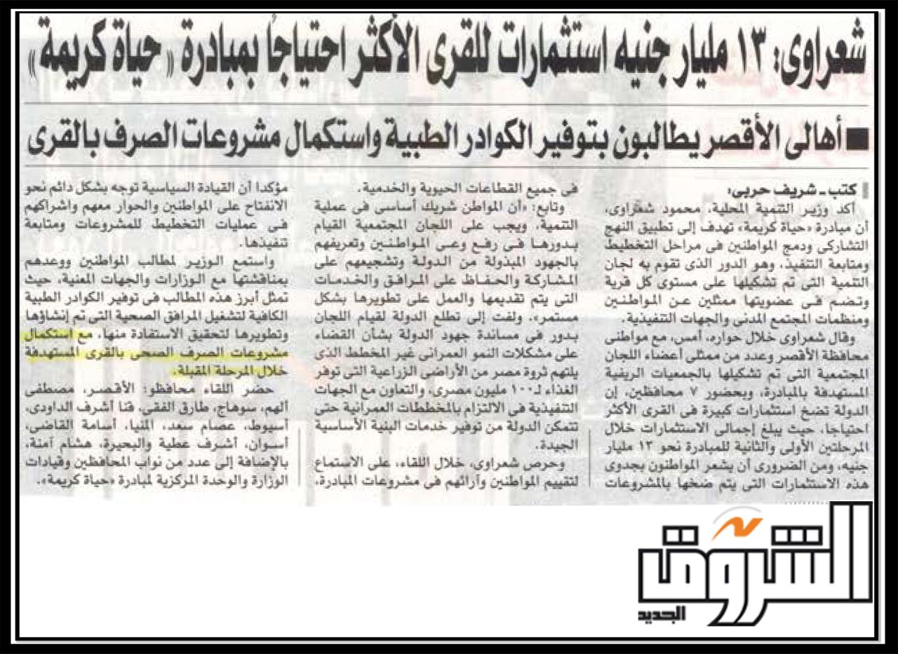 شعراوي .. 13 مليار جنية استثمارات للقرى الاكثر احتياجا بمبادرة ” حياة كريمه “