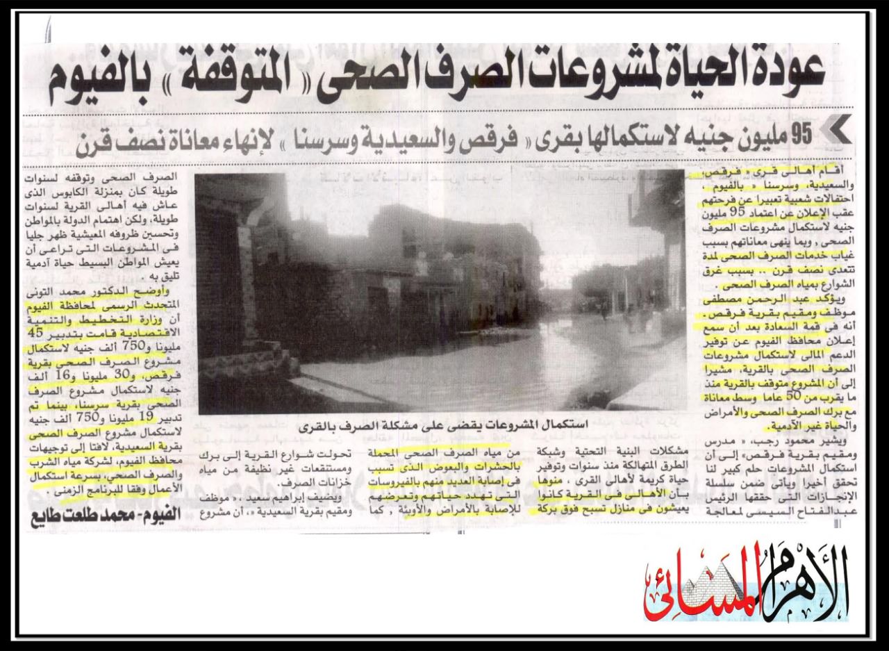 عودة الحياة لمشروعات الصرف الصحي المتوقفة بالفيوم .
