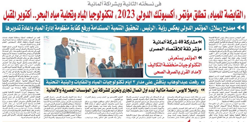 في نسخته الثانية وبشراكة ألمانية : القابضة للمياه تطلق مؤتمر ” أكسبوتك 2023″ لتكنولوجيا المياه وتحلية مياه البحر … أكتوبر المقبل
