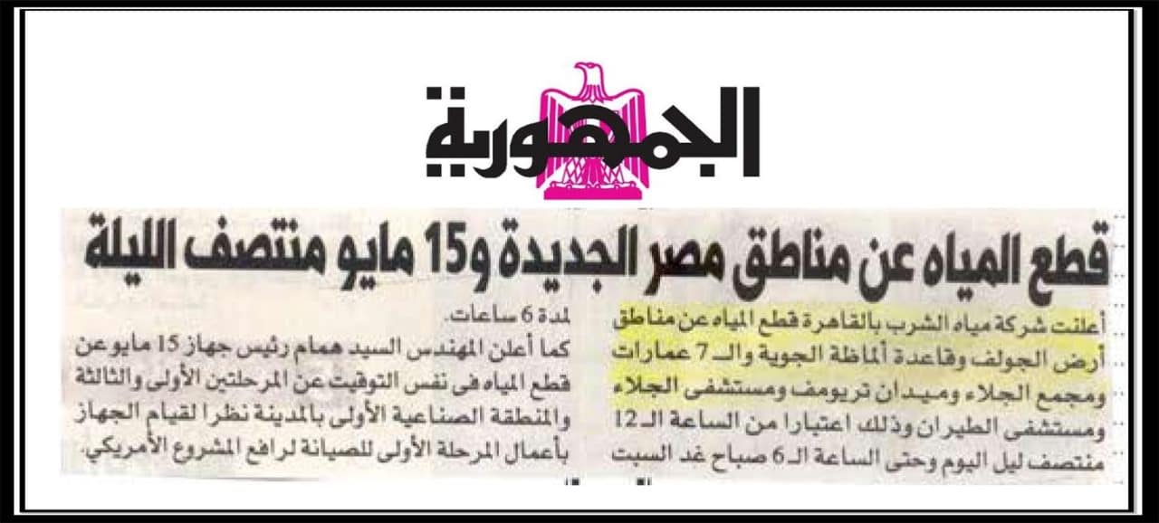 قطع المياه عن مناطق مصر الجديدة و 15 مايو منتصف الليلة