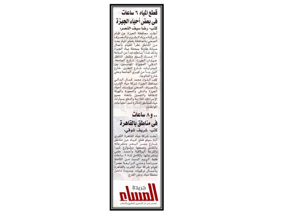 قطع المياه 6 ساعات في بعض الاحياء بالجيزة …و 8 ساعات في مناطق القاهرة .