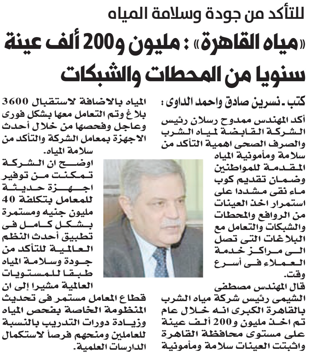 للتأكد من جدة وسلامة المياه.. “مياه القاهرة ” مليون و200 الف عينة سنوياً من المحطات والشبكات.