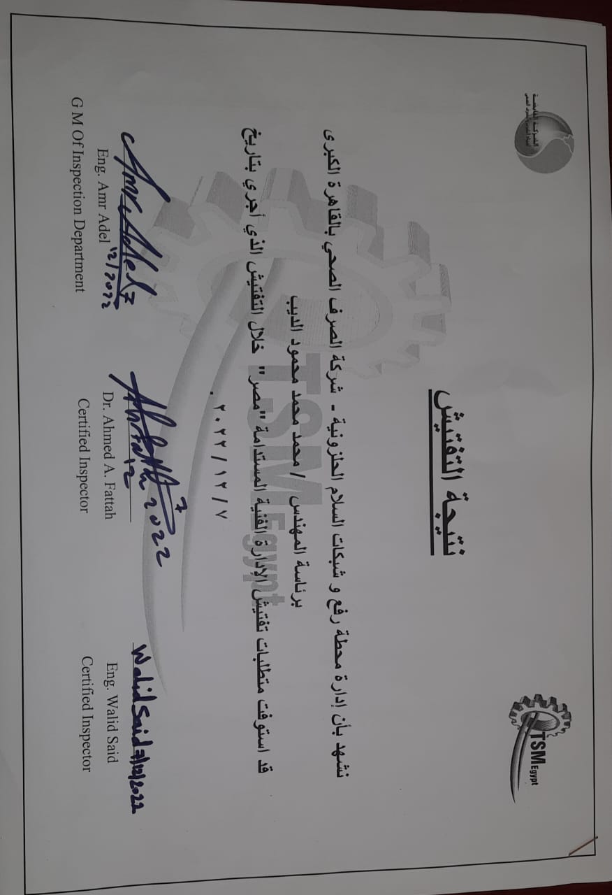 “للمرة الأولى… محطة السلام الحلزونيه بالقاهرة تحصل على شهادة الإدارة الفنية المستدامة T.S.M”