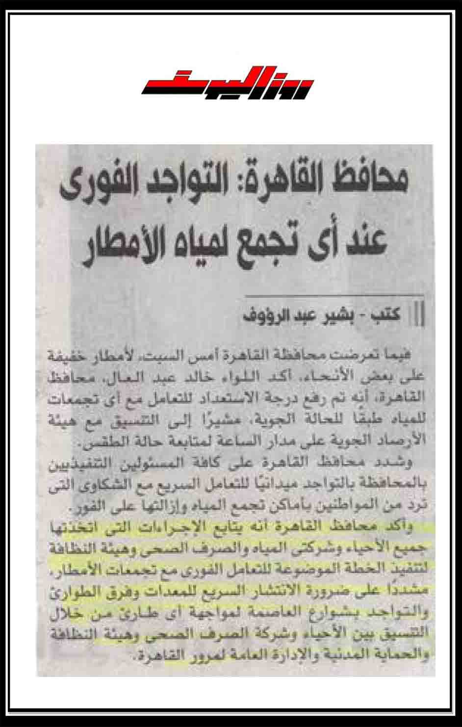 محافظ القاهرة : التواجد الفوري عند أي تجمع لمياه الامطار .
