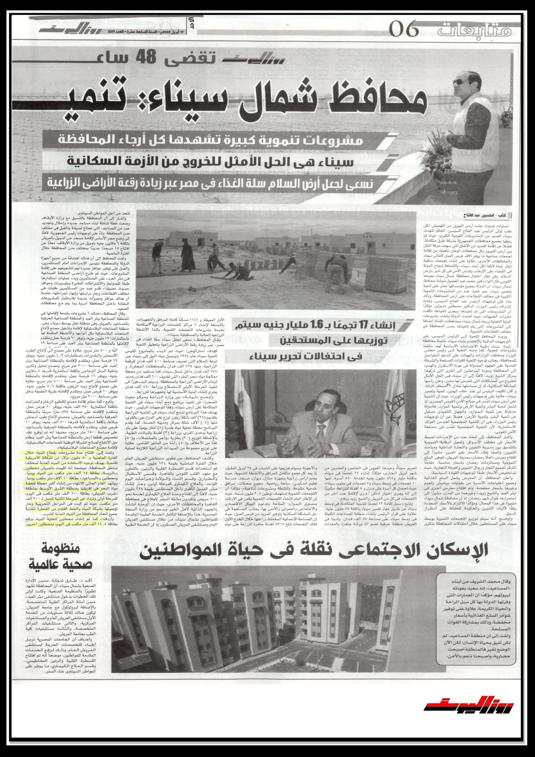 محافظ شمال سيناء: مشروعات تنموية كبيرة تستهدف كل ارجاء المحافظة .