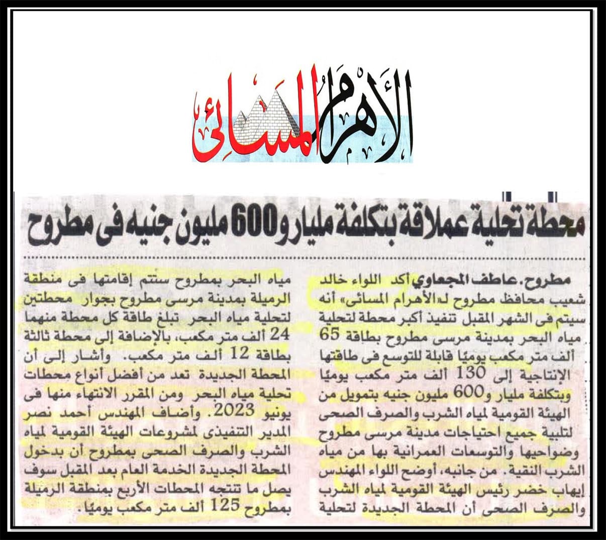 محطة تحلية عملاقة بتكلفة مليار و 600 مليون جنية في مطروح
